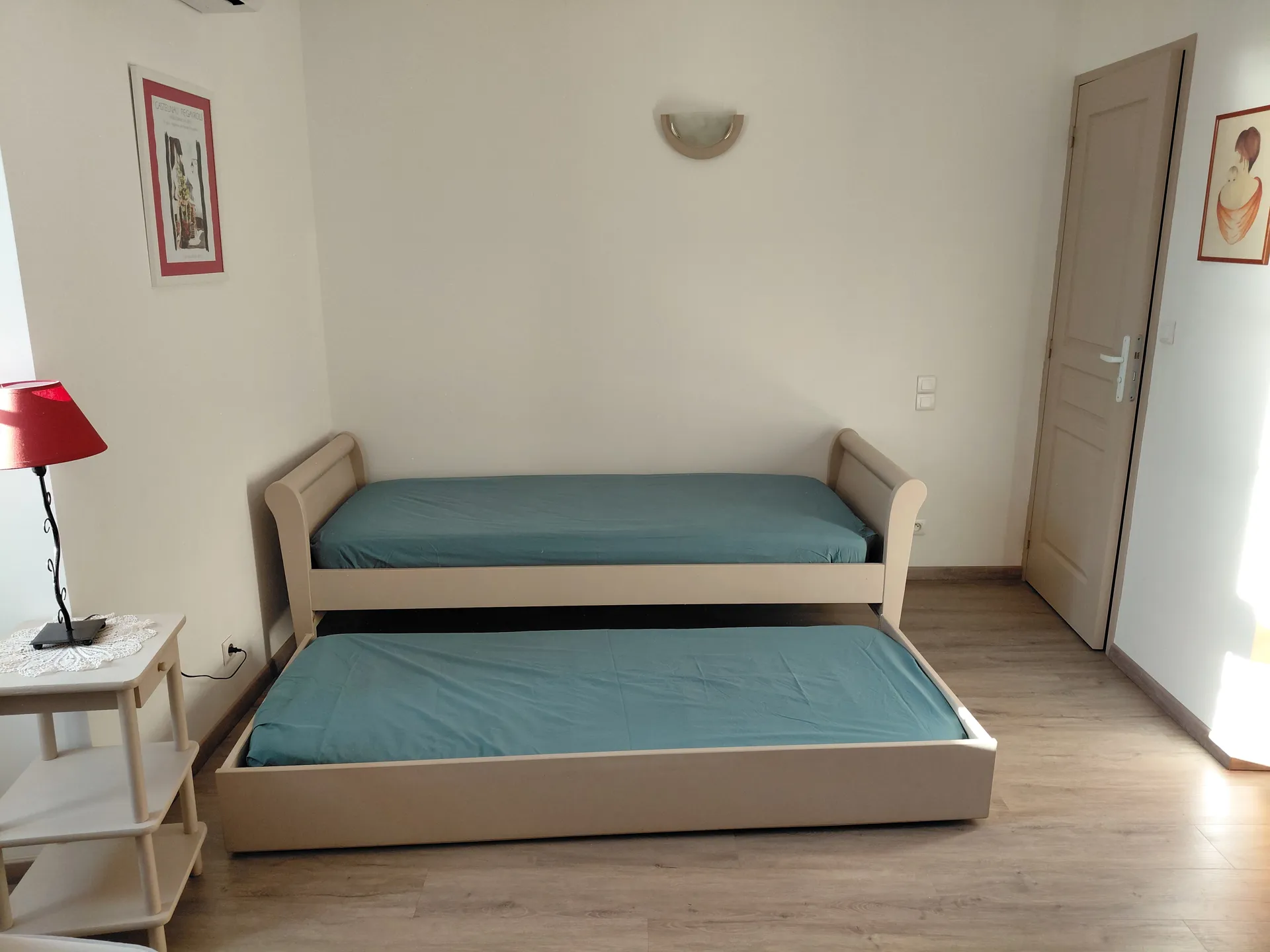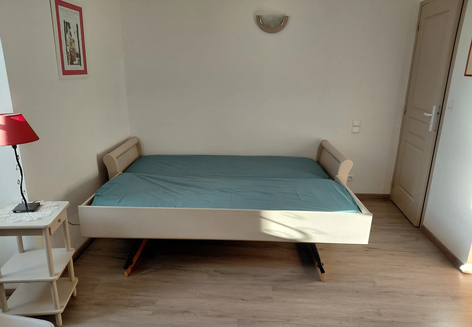 Il est composé d'une cuisine intégrée : plaque, réfrigérateur, four, hotte, machine à café et le nécessaire de cuisine. Côté séjour: lit gigogne qui permet 1 grand lit ou 2 petits lits au choix, une table de chevet, 2 chaises et 2 tabourets, 1 table,1 meuble d'entrée, téléviseur, poste radio, livres et jeux. Salle d'eau. Climatisation réversible. A l'extérieur devant de porte ; table et chaises. Lit enfant sur demande. Parking libre en face et possibilité de parking privatif couvert gratuit pour 2 roues.