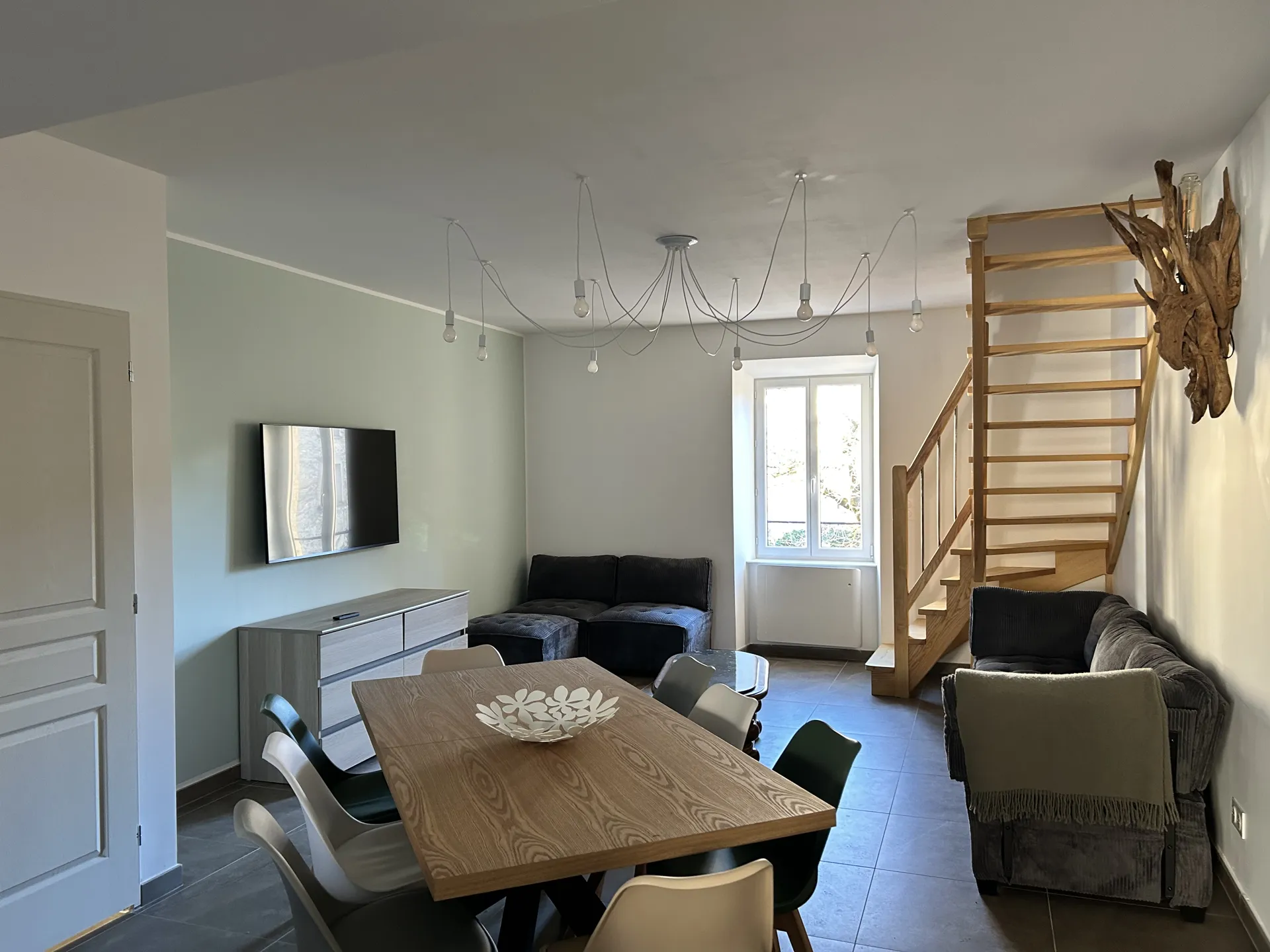 Au premier étage, vous profiterez d’un vaste séjour baigné de lumière, aménagé avec un grand canapé entièrement modulable (pouvant faire un lit d'appoint) et une télévision. Côté repas, une grand table extensible peut accueillir confortablement 8 convives.