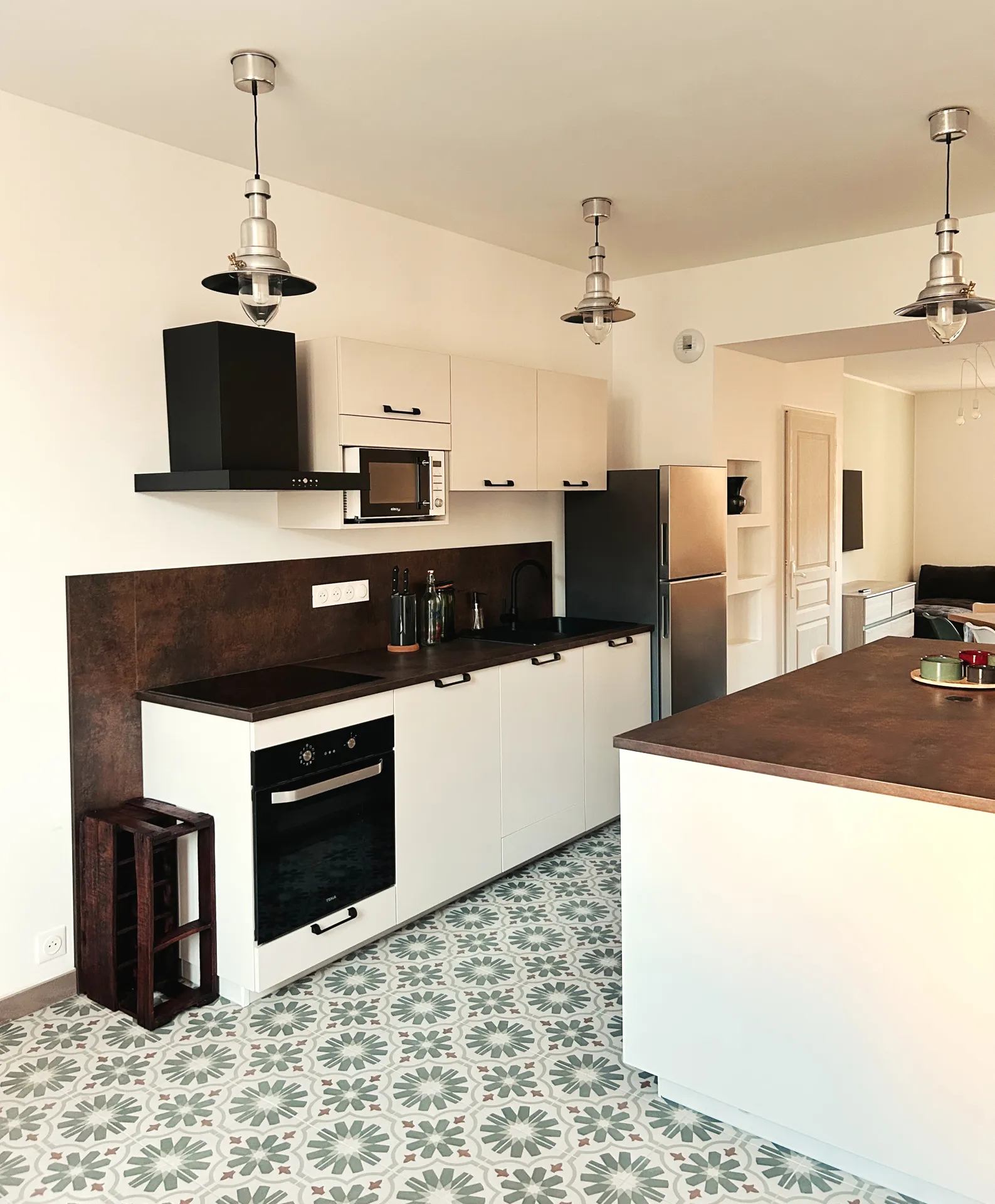 Une cuisine ouverte entièrement équipée vous attend : son îlot central est parfait pour les petits-déjeuners. Une prise USB intégrée à l’îlot central permet de recharger son téléphone ou sa tablette pendant le petit-déjeuner : idéal pour planifier tranquillement ses randonnées ou les activités de la journée. Vous trouverez également une buanderie avec un lave-linge et un sèche linge ainsi qu'un petit coin détente avec des jeux de société et de la documentation touristique.