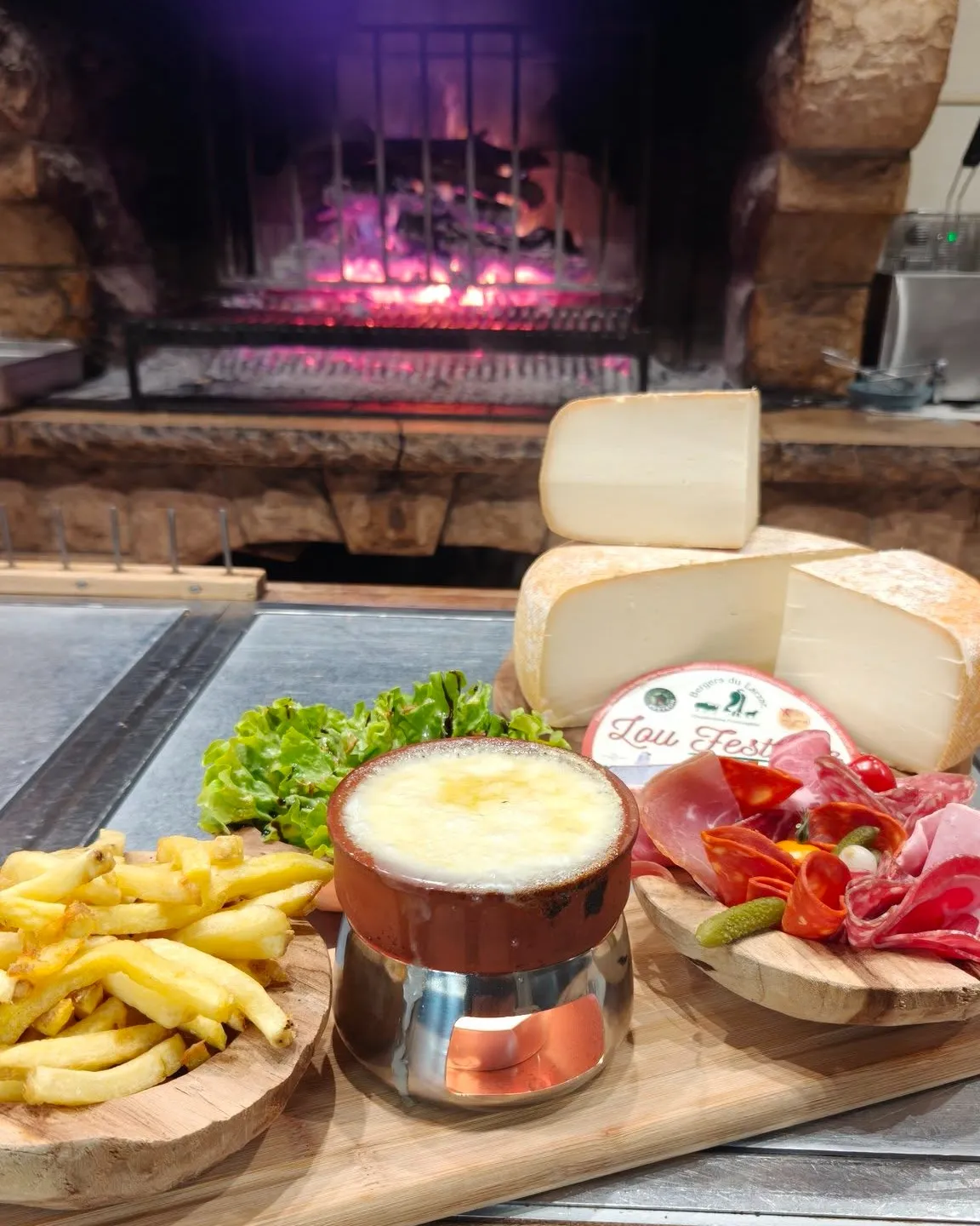 Une salle avec vue sur la cuisine ouverte et sa cheminée servant aux cuissons au feu de bois et de belles tables hautes, dans la salle du bar. Dès que les rayons du soleil le permettent, un bel espace terrasse vous permet d’apprécier votre repas en terrasse !